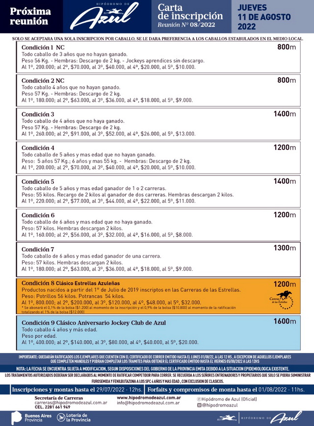 El viernes 29 a las doce horas, cierran las inscripciones. Forfaits y compromisos de monta: lunes 1° de agosto a las doce horas.
